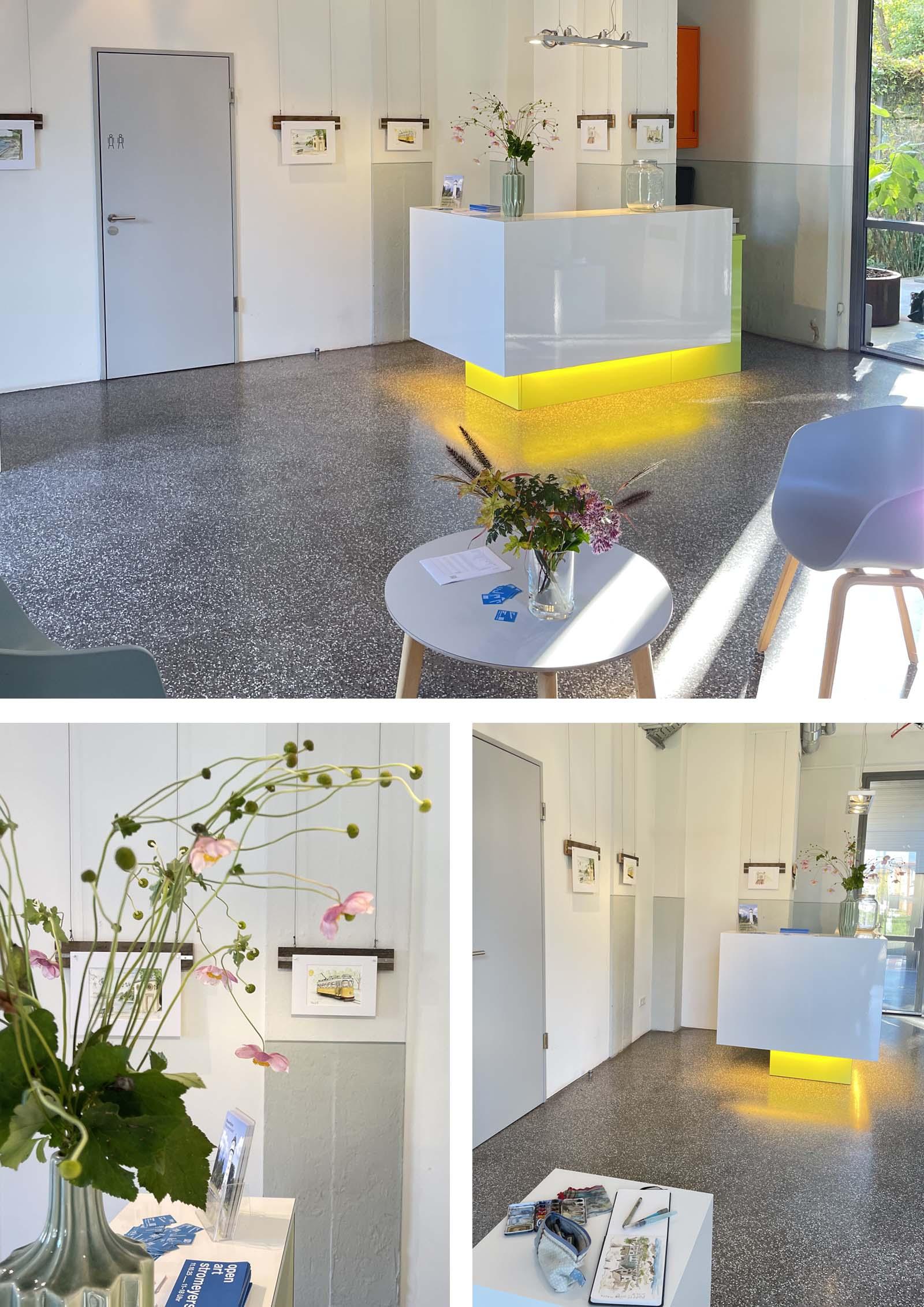 Im Empfangsbereich, im Erdgeschoss des Turmes, werden regelmäßig Ausstellungen gezeigt. In kleinem und feinem Ambiente, können Sie eine Auswahl Ihrer Werke der Öffentlichkeit präsentieren.